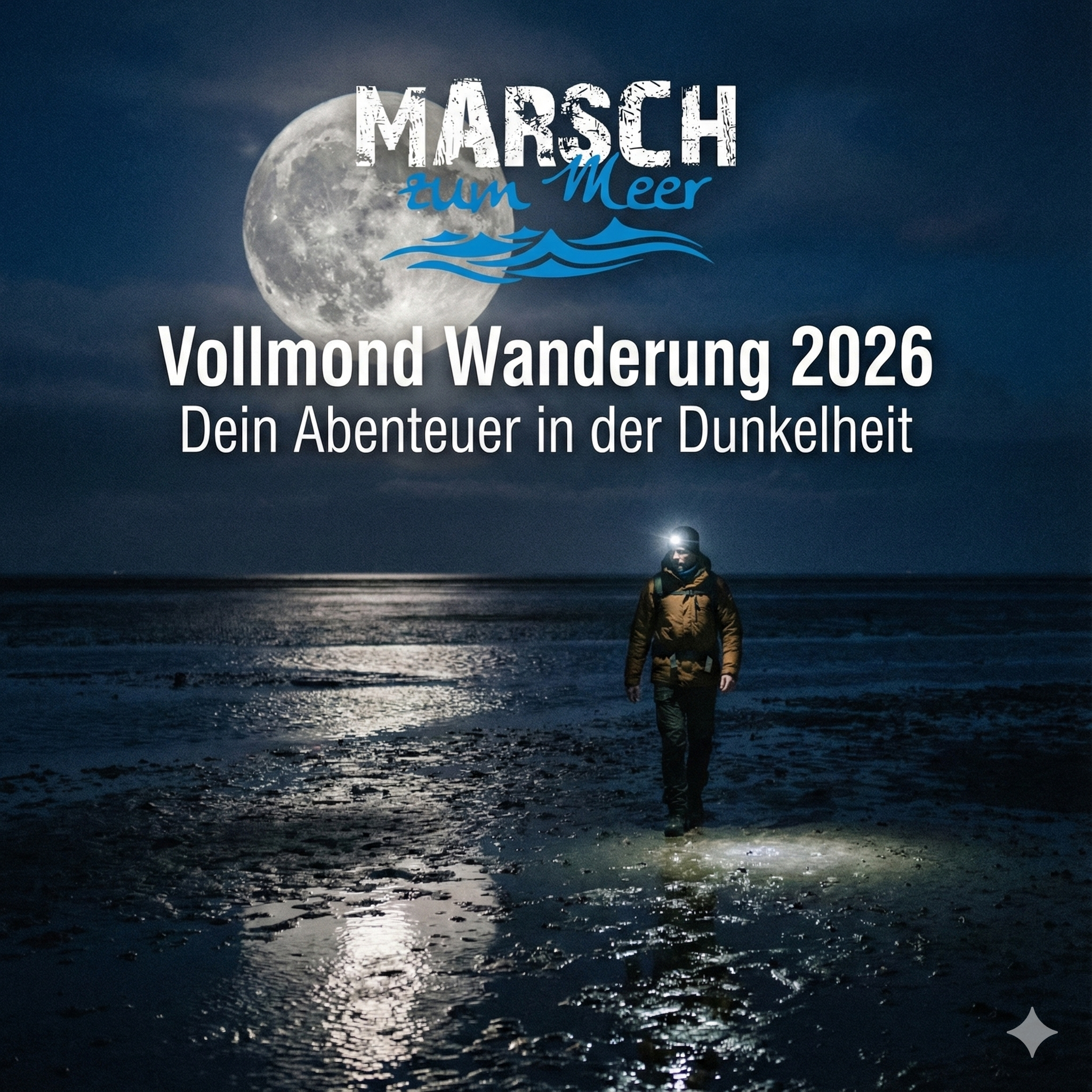 Starte das Jahr 2026 mit einem Erlebnis, das unter die Haut geht. Am 03. Januar 2026 laden wir zur Vollmond Wanderung in Husum ein. Wenn das silberne Mondlicht das Wattenmeer in eine surreale Kulisse taucht, sind wir unterwegs. Keine Hektik, kein Wettkampf, nur achtsames Gehen und die Magie der Nacht.